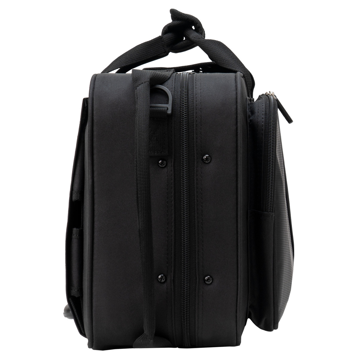 De polstrede ryggsekkreimene kan gjemmes ved behov. En justerbar skulderreim følger med. En lang ytterlomme gir plass til for eksempel en fløyte eller et notestativ.