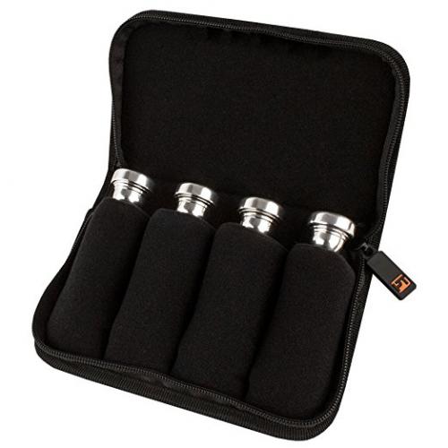 Munnstykkeetui for småmessing i nylon, med glidelås. Denne har plass til fire munnstykker, og er ideell for den som veksler mellom trompet, kornett og flygelhorn, eller for munnstykkeentusiaster. Kan festes i belte. Egen lomme i front med gidelås med plass til for eksempel munnstykkebørste.