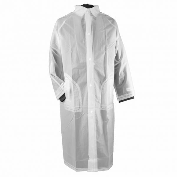 Regnfrakk med krage, produsert av tynt EVA (etylenvinylacetat) plastmateriale. Hvit og delvis gjennomsiktig med to lommer i front. Små trykknapper.