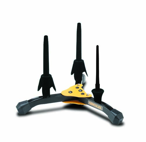 Dette stativet er laget for piccolo, fløyte og klarinett. To av piggene kan brukes til enten fløyte eller klarinett. Det er med andre ord flere mulige varianter av instrument du kan ha på dette: